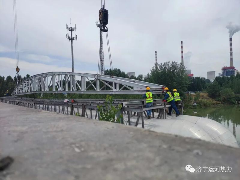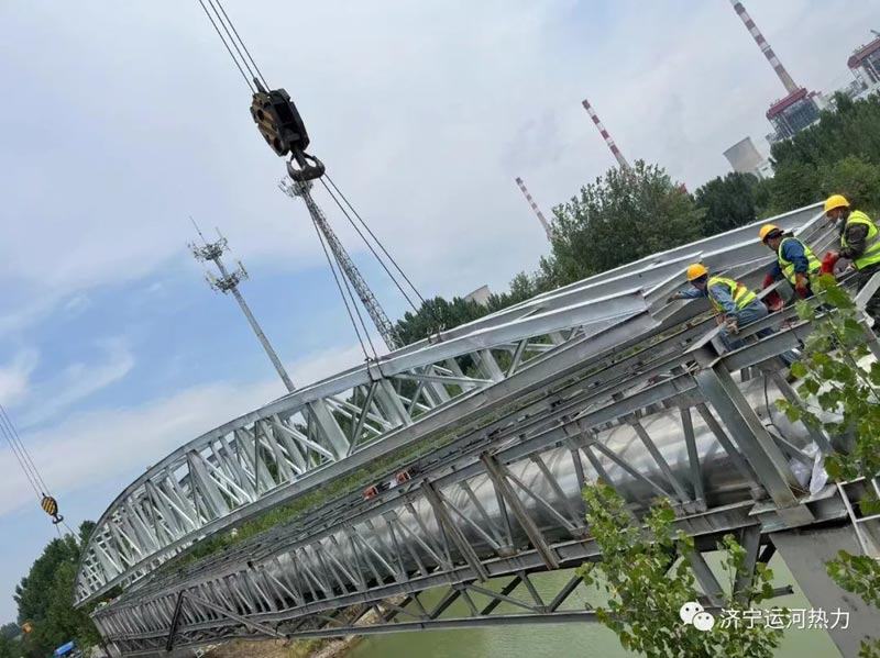 随着指挥员的一声哨响,2022年6月14日11点19分,两部硕大的吊车缓缓放下钢索,跨度为51米的跨河供热主管网加固支架顺利吊装完成,这标志着AG奥林匹斯之门游戏1000倍·(中国区)官方网站 的跨河DN1200的供热主管网的安全隐患彻底消除,同时也为济宁内陆主城港区航道的升级改造扫除了卡脖子工程。