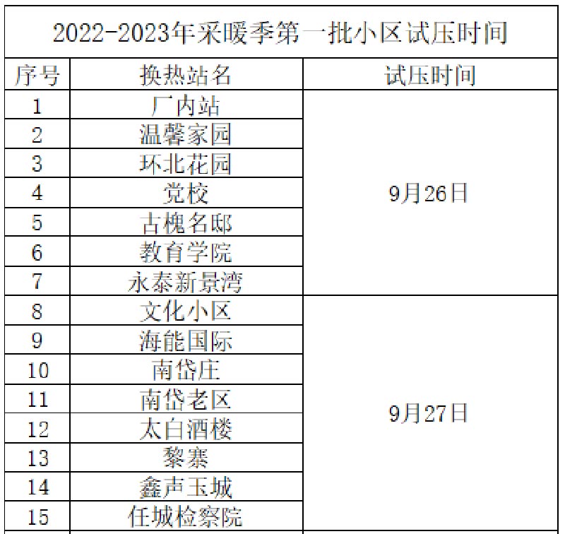 为确保供热管网安全运行,供热主管网注水试压工作已于8月20日启动,供热系统现已整体具备试压条件。各小区的供热试压工作将根据实际情况于9月26日相继开展。试压期间个别小区如因疫情影响不能正常进行的,我公司将以公众号形式另行通知试压时间。请广大用户及时关注我公司微信公众号,留意公众号发布的信息。同时我公司也将及时与各小区物业公司联系,确定小区具体试压时间,请广大用户及时与小区物业联系或留意物业公司发布的相关信息。